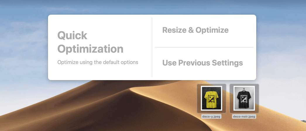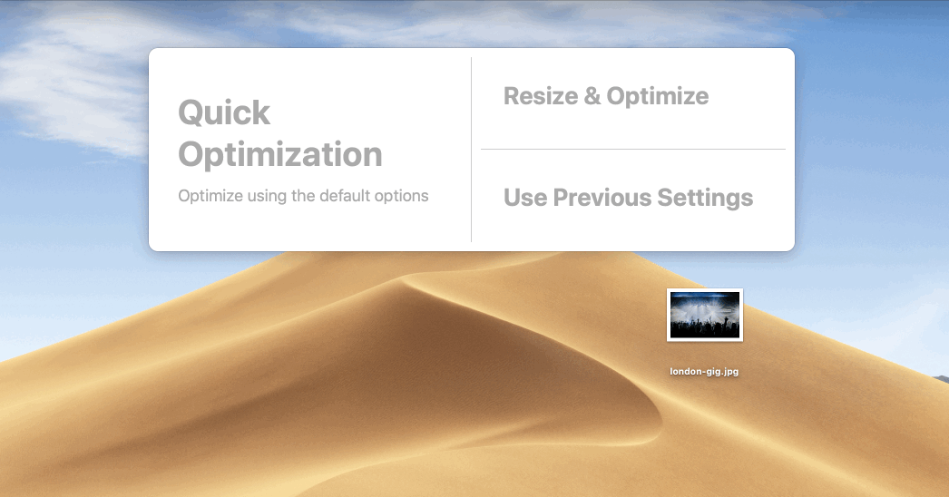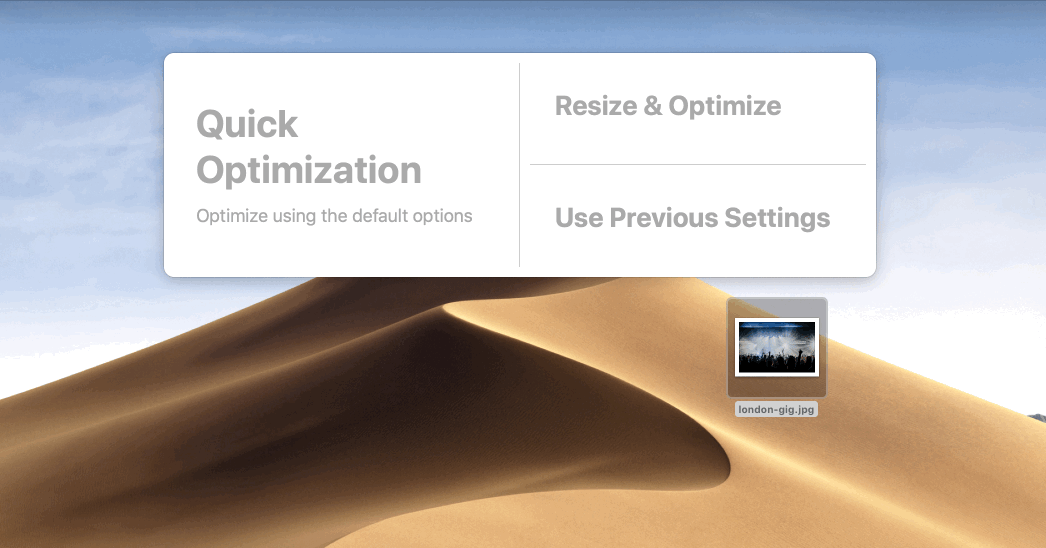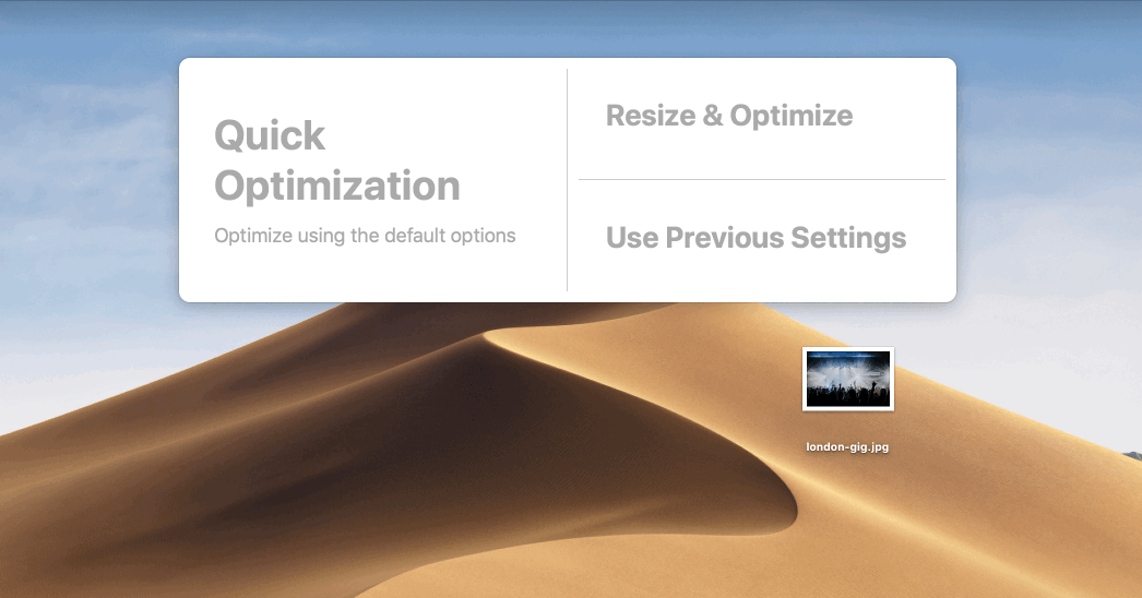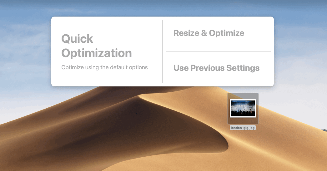 Unlike online tools, there are no limits to the size of the files you optimize and processing occurs as soon as you hit go – no uploading necessary.